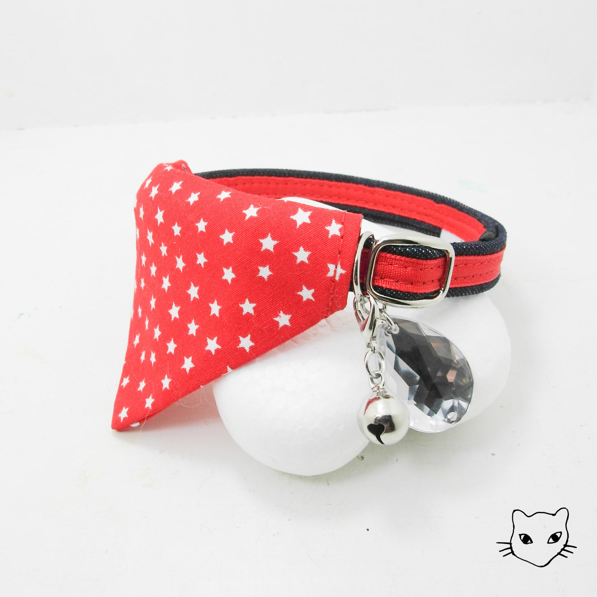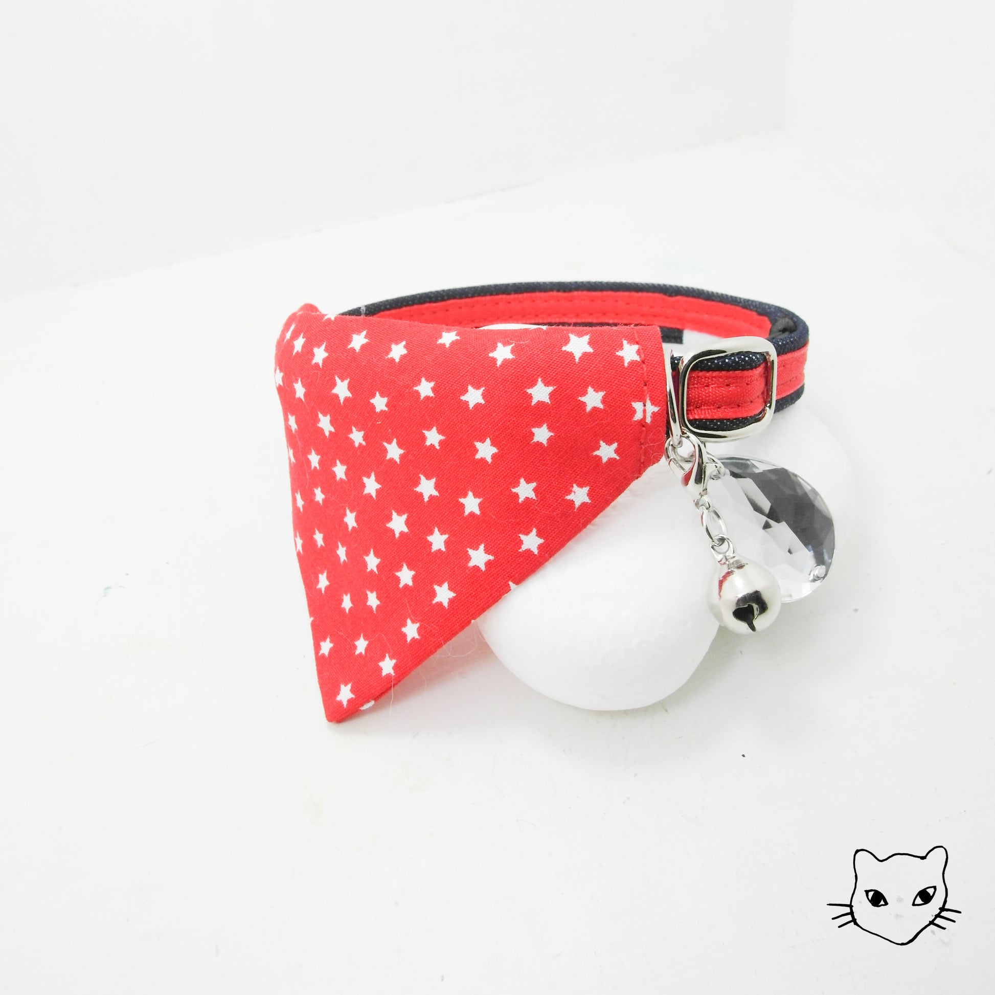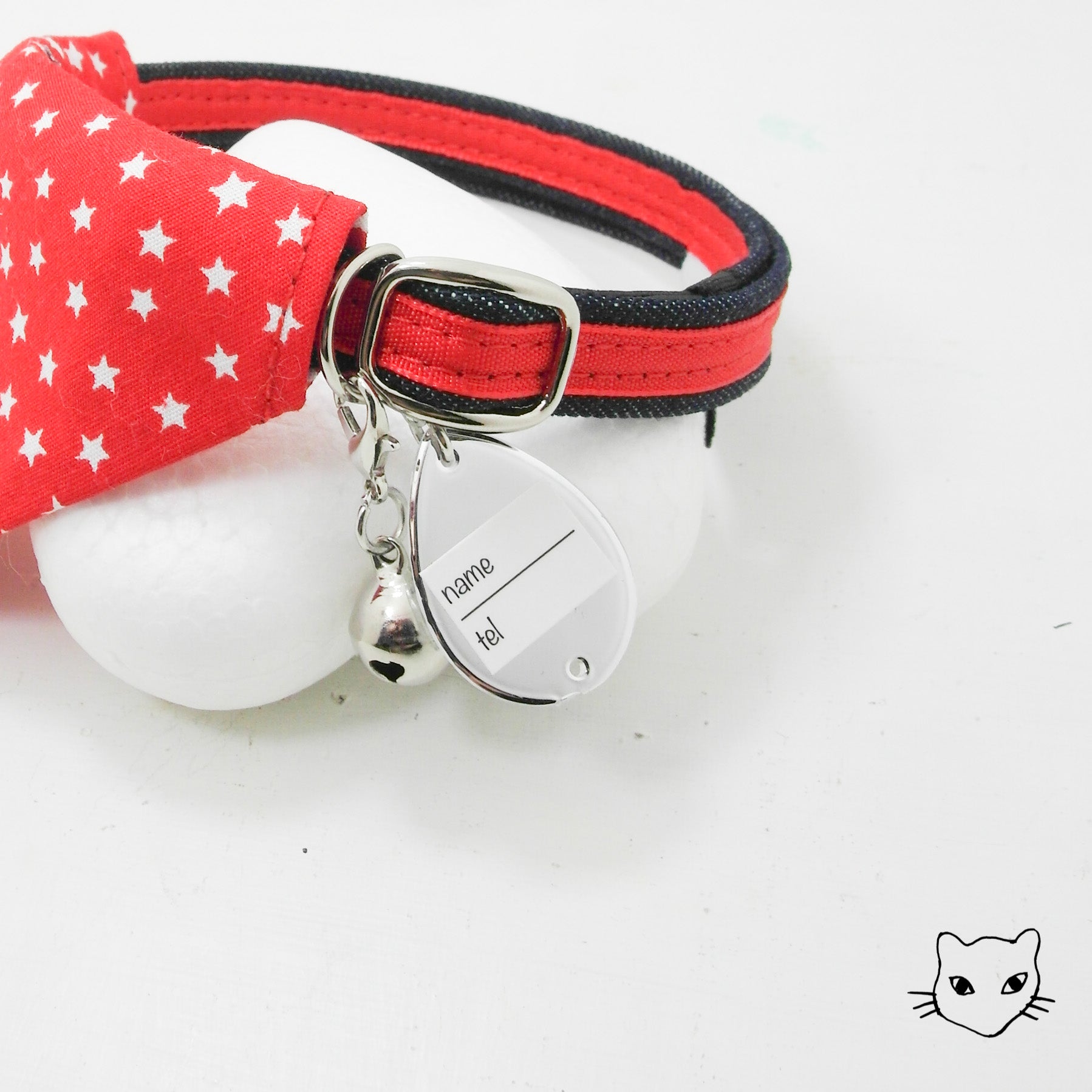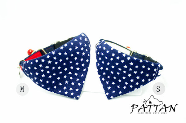 雙面三角巾上滿載星星,閃亮如鑽的那一顆,我們把它製作成安心名牌,背面可貼上內附的聯絡資訊貼紙,好讓星星指引出回家的路。獨家彈性安心項圈設計,彈性繩受力自動變長好鬆脫,緊緻造型之外,更讓安心滿分。為貓咪量身定製的大小合適,美觀為上,更重要的是貓咪整天的舒適體驗。全項圈高品質 100% 手工裁切縫製,嚴選台灣優質緞帶,舒適的可調長度項圈,自由調整 20 ~ 50 cm,可一路陪伴各種大中小型貓的手工貓項圈。