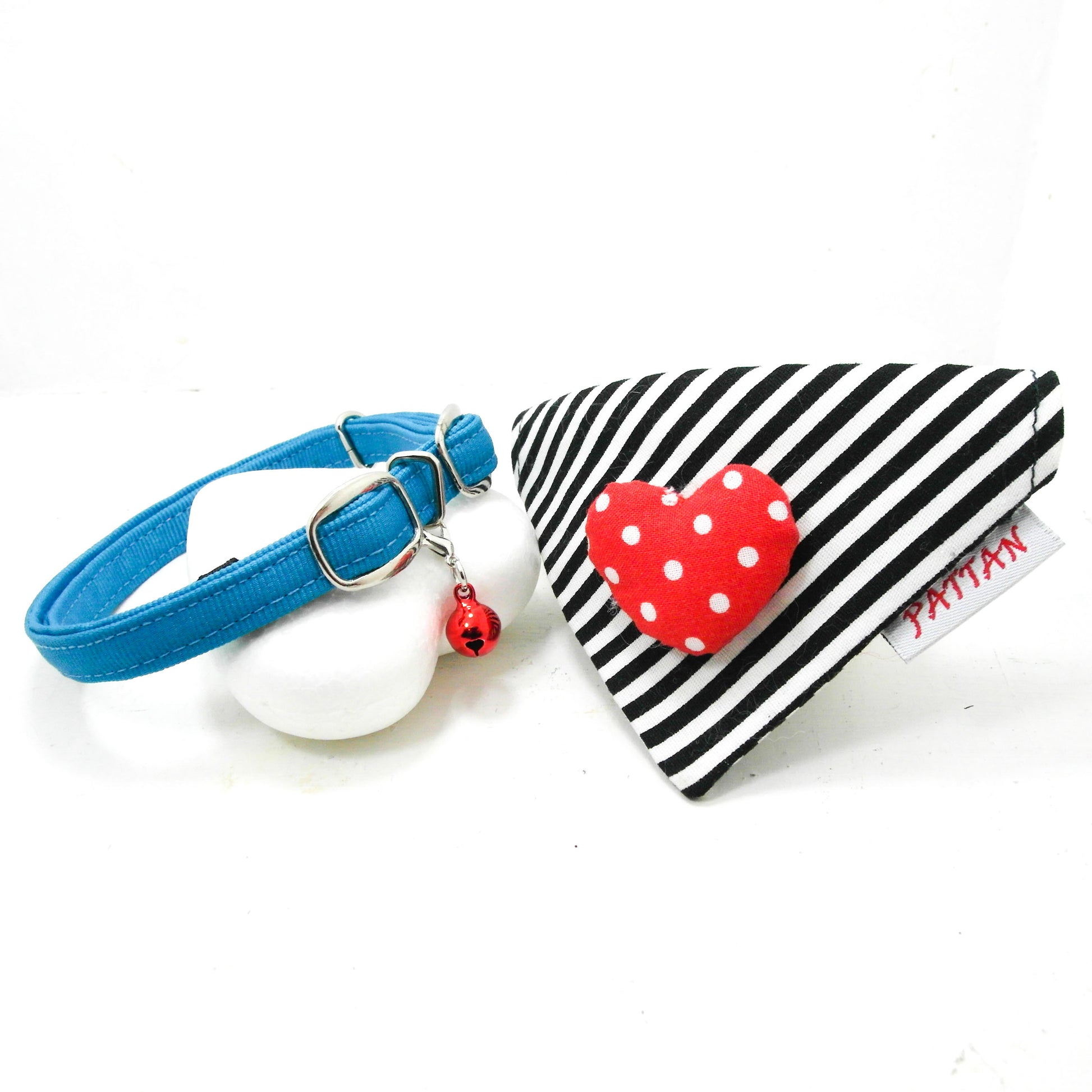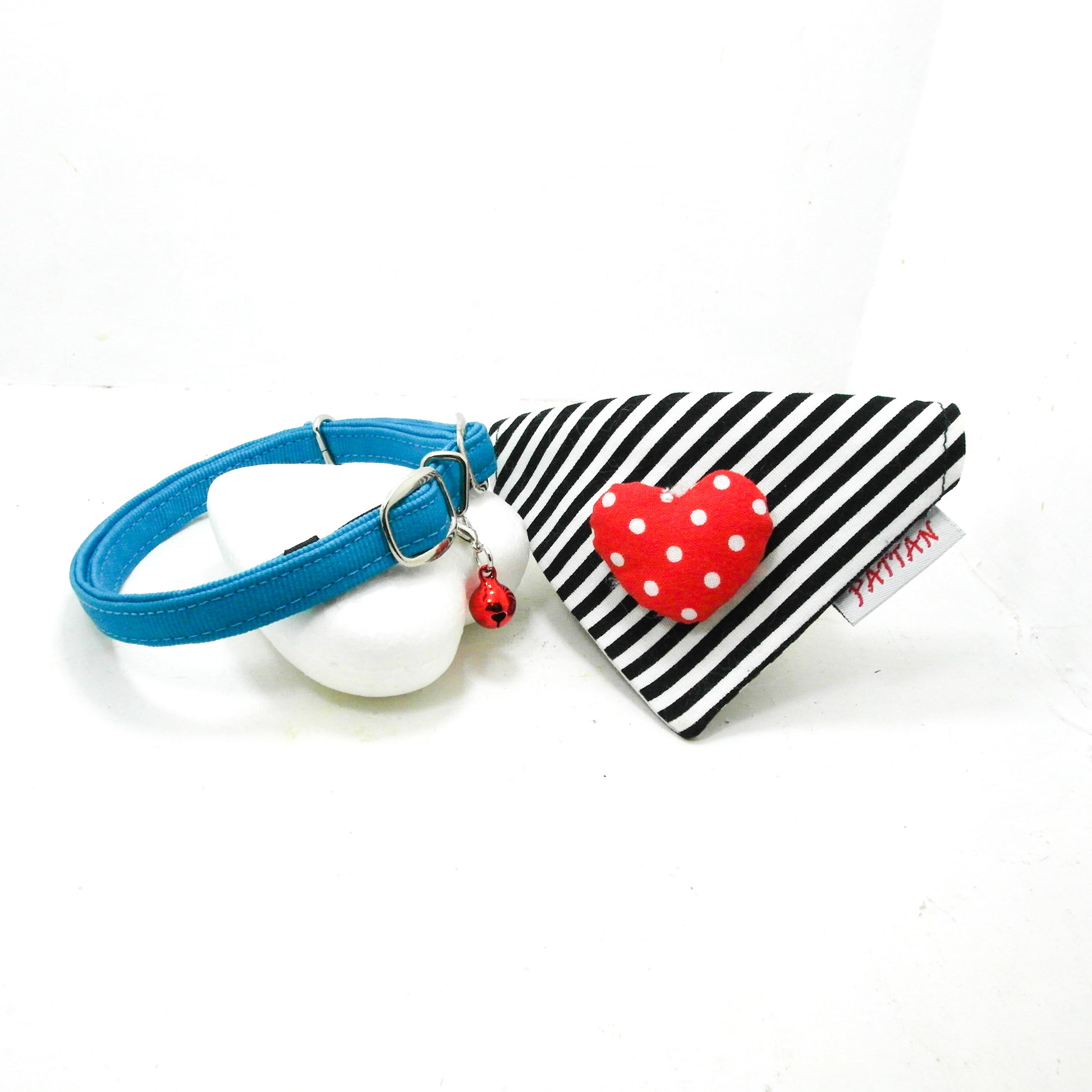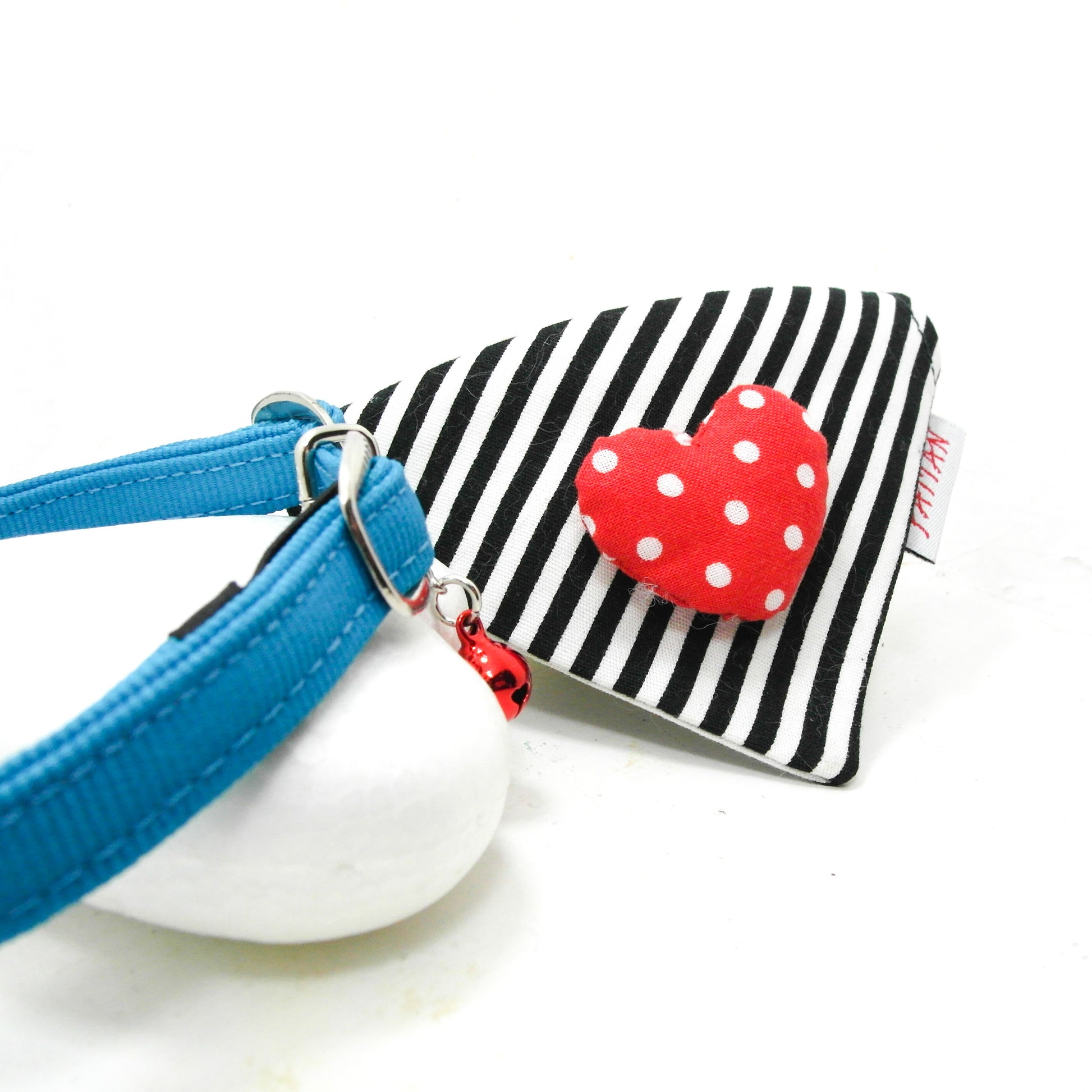 立體愛心布面配飾,黑白條紋襯底三角巾,獨家彈性安心項圈設計,彈性繩受力自動變長好鬆脫,緊緻造型之外,更讓安心滿分。為貓咪量身定製的大小合適,美觀為上,更重要的是貓咪整天的舒適體驗。全項圈高品質 100% 手工裁切縫製,嚴選台灣優質緞帶,舒適的可調長度項圈,自由調整 20 ~ 50 cm,可一路陪伴各種大中小型貓的手工貓項圈。