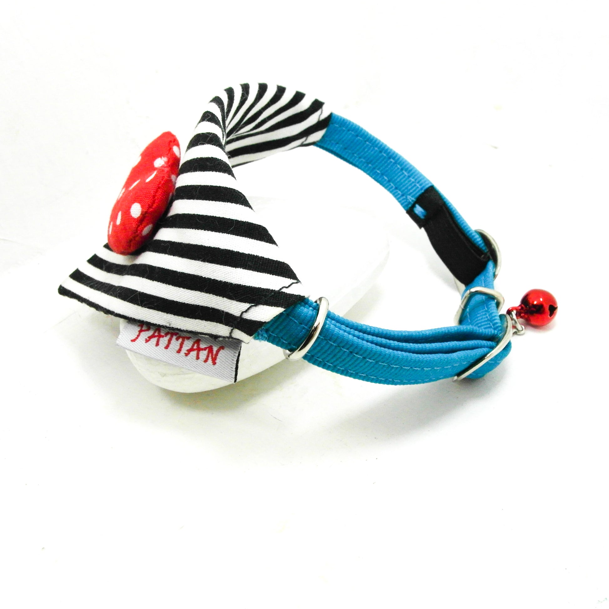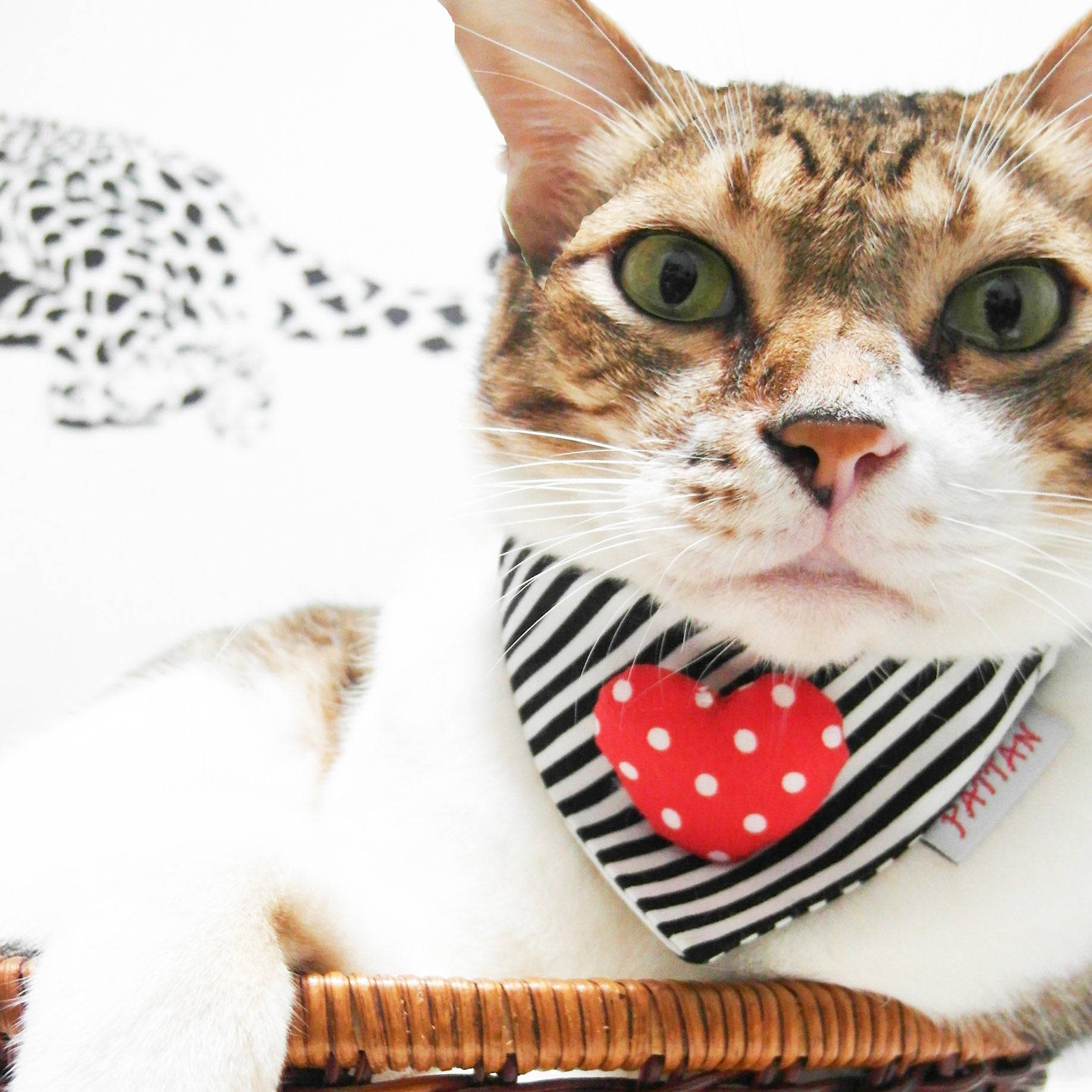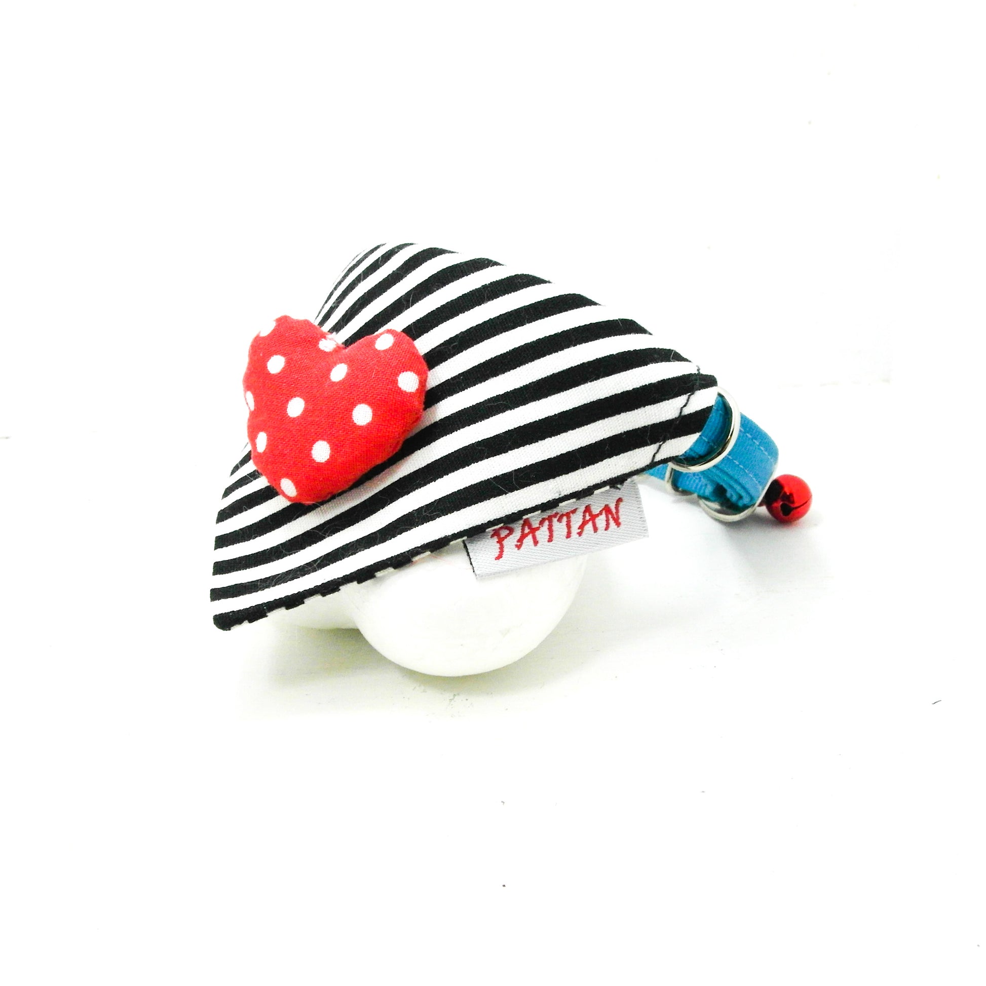 立體愛心布面配飾,黑白條紋襯底三角巾,獨家彈性安心項圈設計,彈性繩受力自動變長好鬆脫,緊緻造型之外,更讓安心滿分。為貓咪量身定製的大小合適,美觀為上,更重要的是貓咪整天的舒適體驗。全項圈高品質 100% 手工裁切縫製,嚴選台灣優質緞帶,舒適的可調長度項圈,自由調整 20 ~ 50 cm,可一路陪伴各種大中小型貓的手工貓項圈。