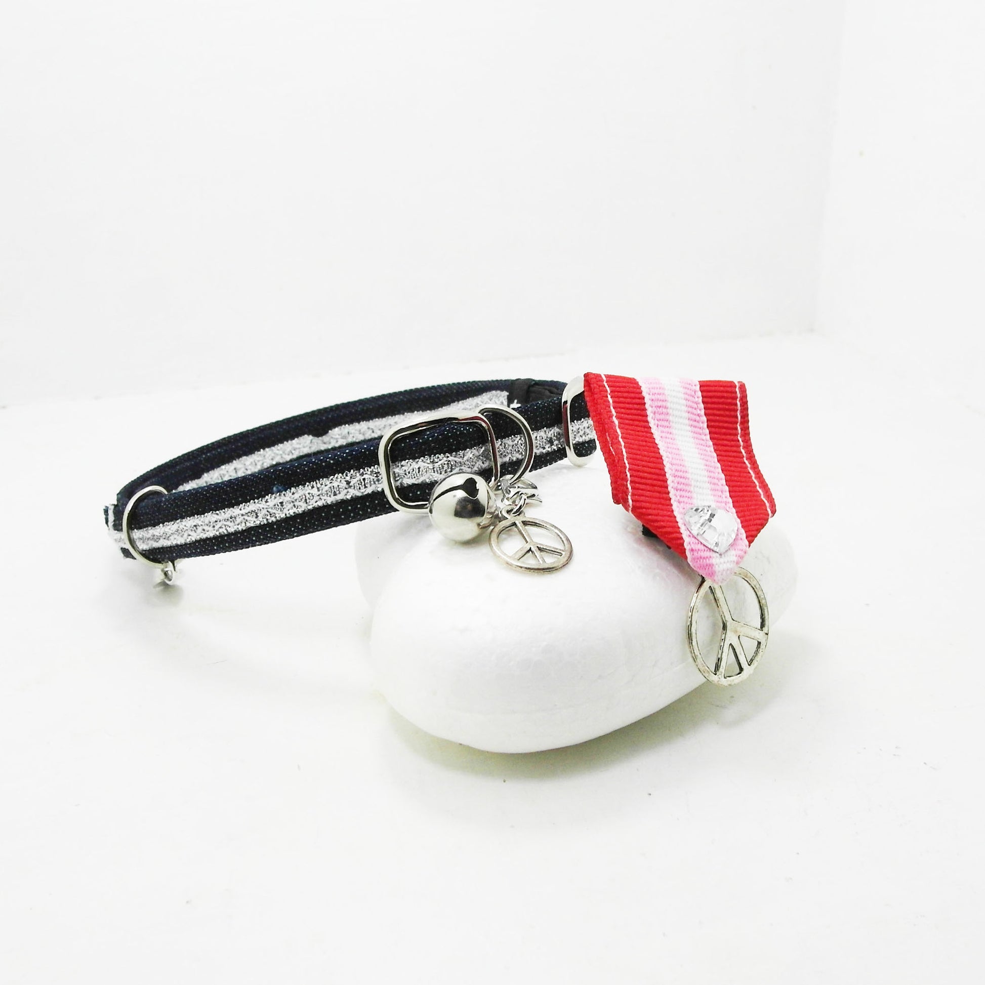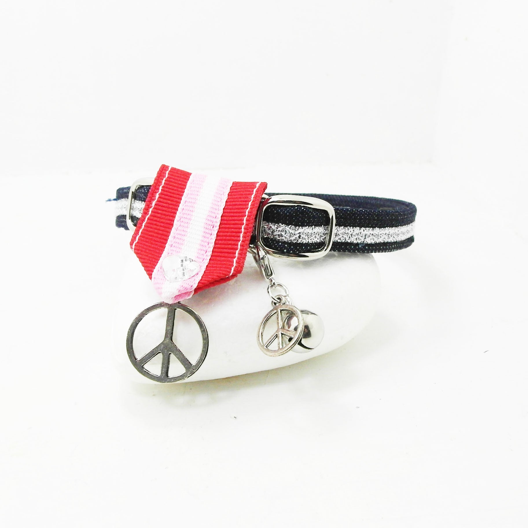 暖色緞帶與愛心水鑽樣式搭配象徵和平符號,配上銀蔥項圈,為貓咪傳達出溫暖與希望的訊息。獨家彈性安心項圈設計,彈性繩受力自動變長好鬆脫,緊緻造型之外,更讓安心滿分,活動花釦巧妙的重心配置,讓貓咪帶著跑跳玩耍後只要甩甩頭,花釦便會自然回到胸前,依然優雅。為貓咪量身定製的大小合適,美觀為上,更重要的是貓咪整天的舒適體驗。全項圈高品質 100% 手工裁切縫製,嚴選台灣優質緞帶,舒適的可調長度項圈,自由調整 20 ~ 50 cm,可一路陪伴各種大中小型貓的手工貓項圈。