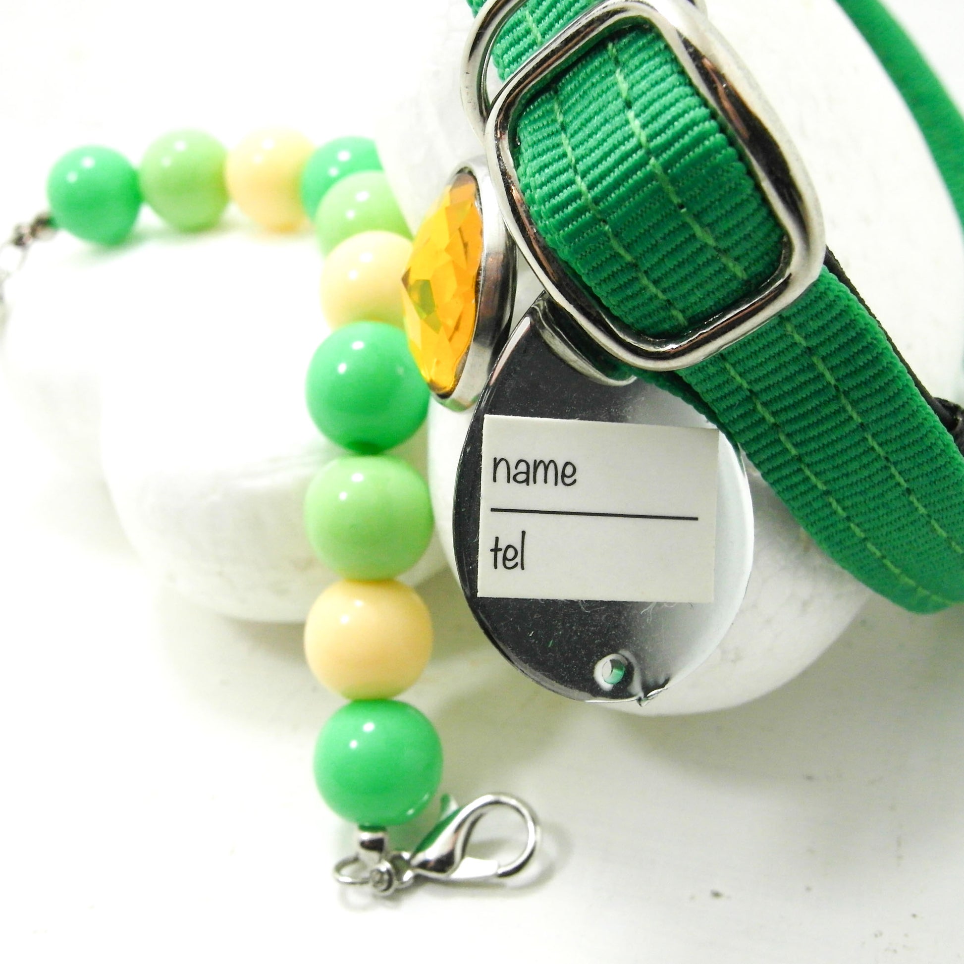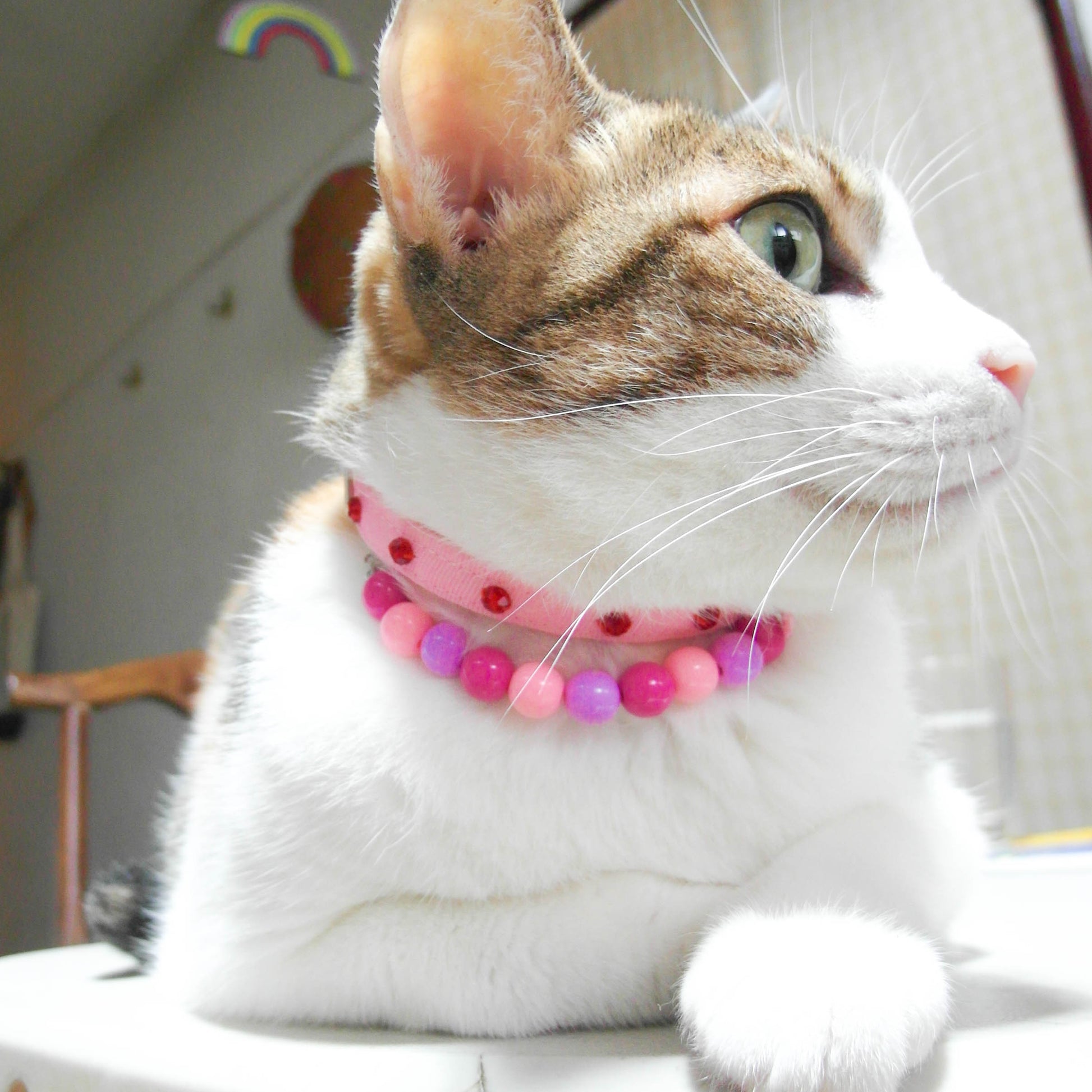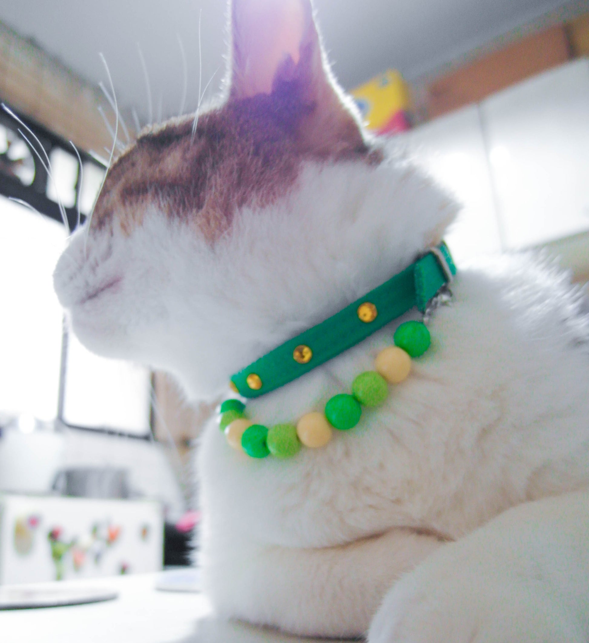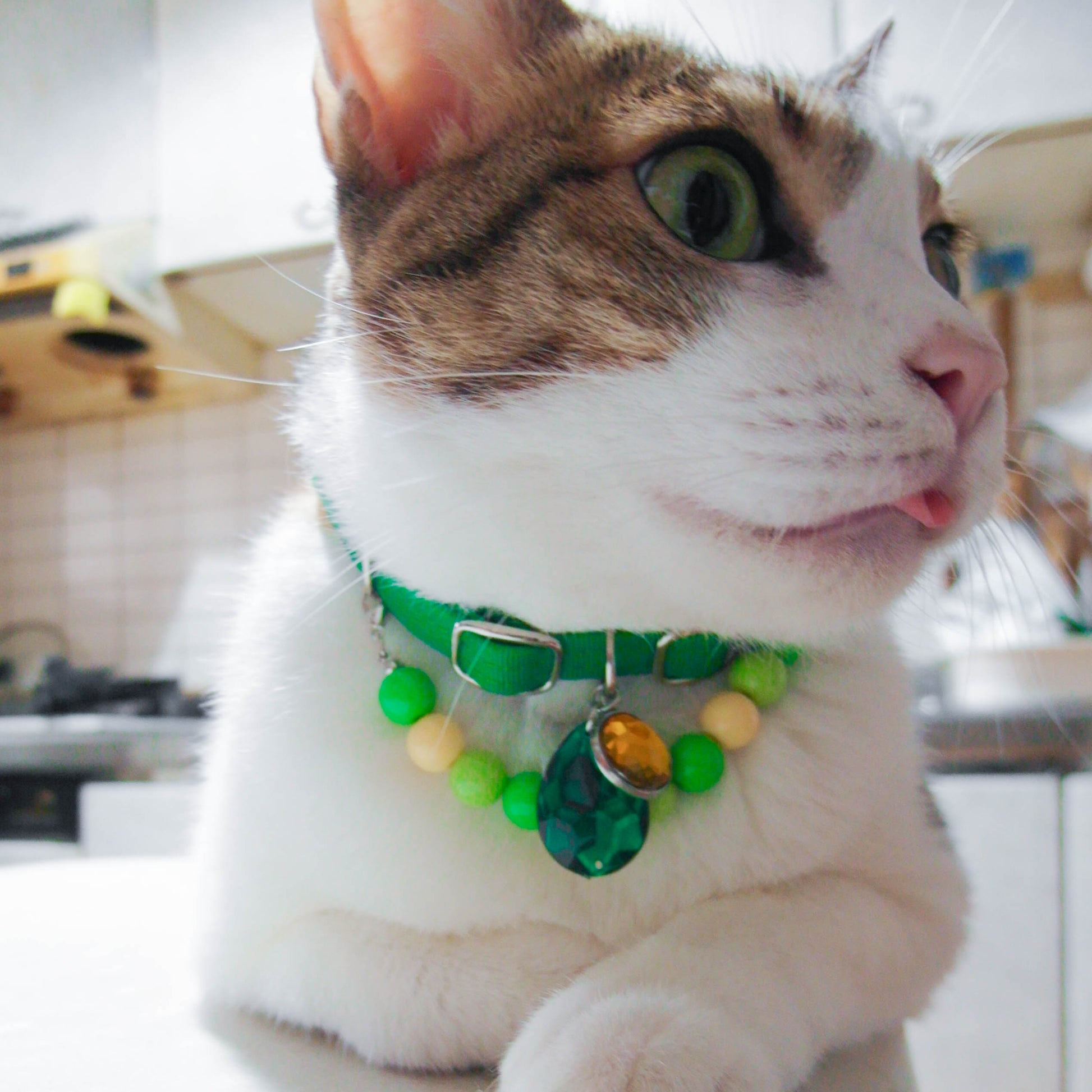 閃亮水鑽造型安心名牌,背面可貼上內附的聯絡資訊貼紙,好讓指引出回家的路。雙色甜美配色串珠項線,粉紅草莓與綠薄荷皆難以抗拒!獨家彈性安心項圈設計,彈性繩受力自動變長好鬆脫,緊緻造型之外,更讓安心滿分。為貓咪量身定製的大小合適,美觀為上,更重要的是貓咪整天的舒適體驗。全項圈高品質 100% 手工裁切縫製,嚴選台灣優質緞帶,舒適的可調長度項圈,自由調整 20 ~ 50 cm,可一路陪伴各種大中小型貓的手工貓項圈。