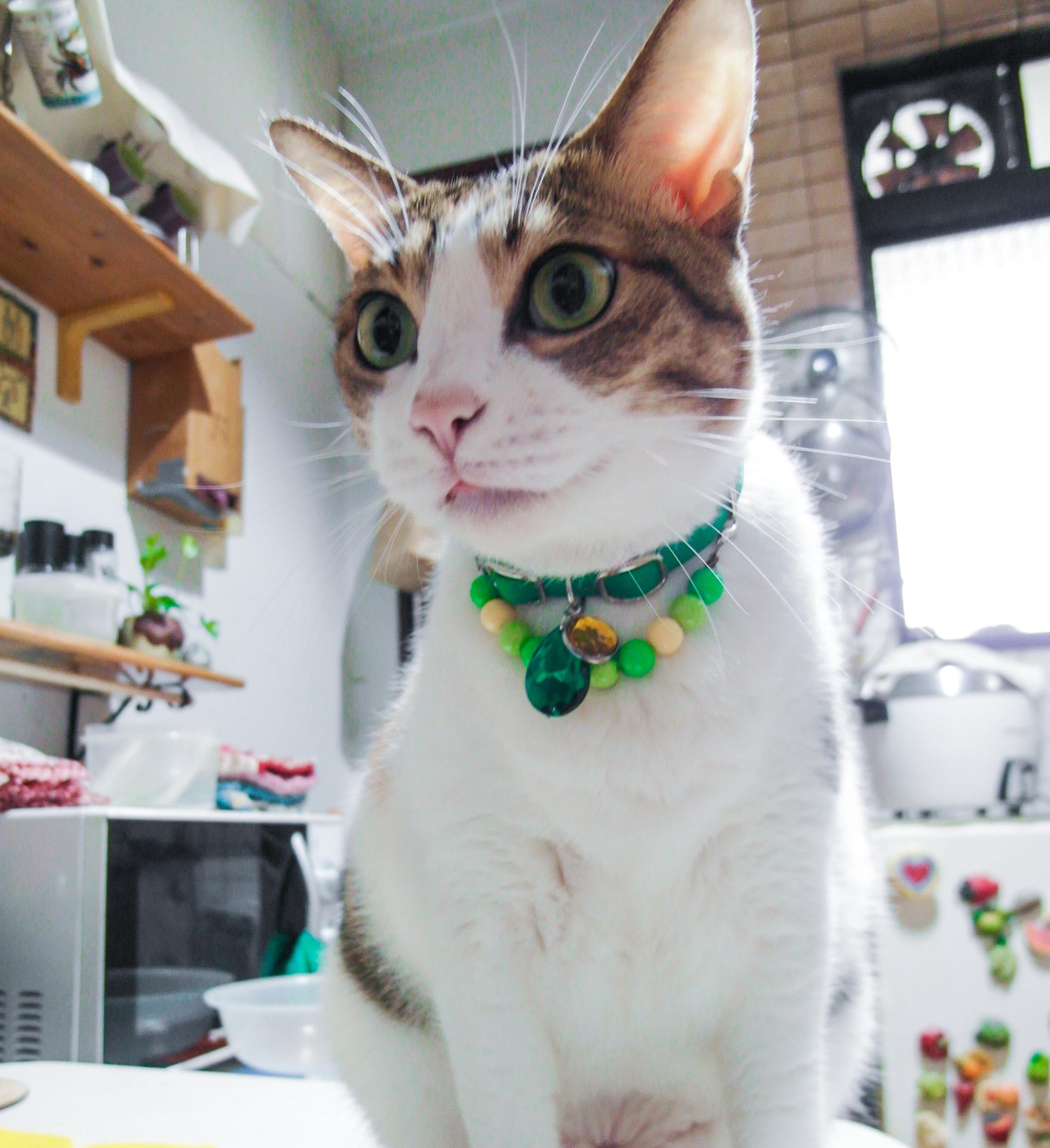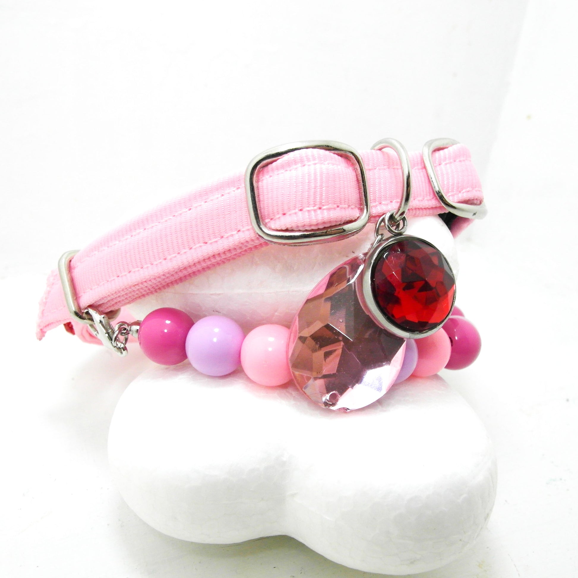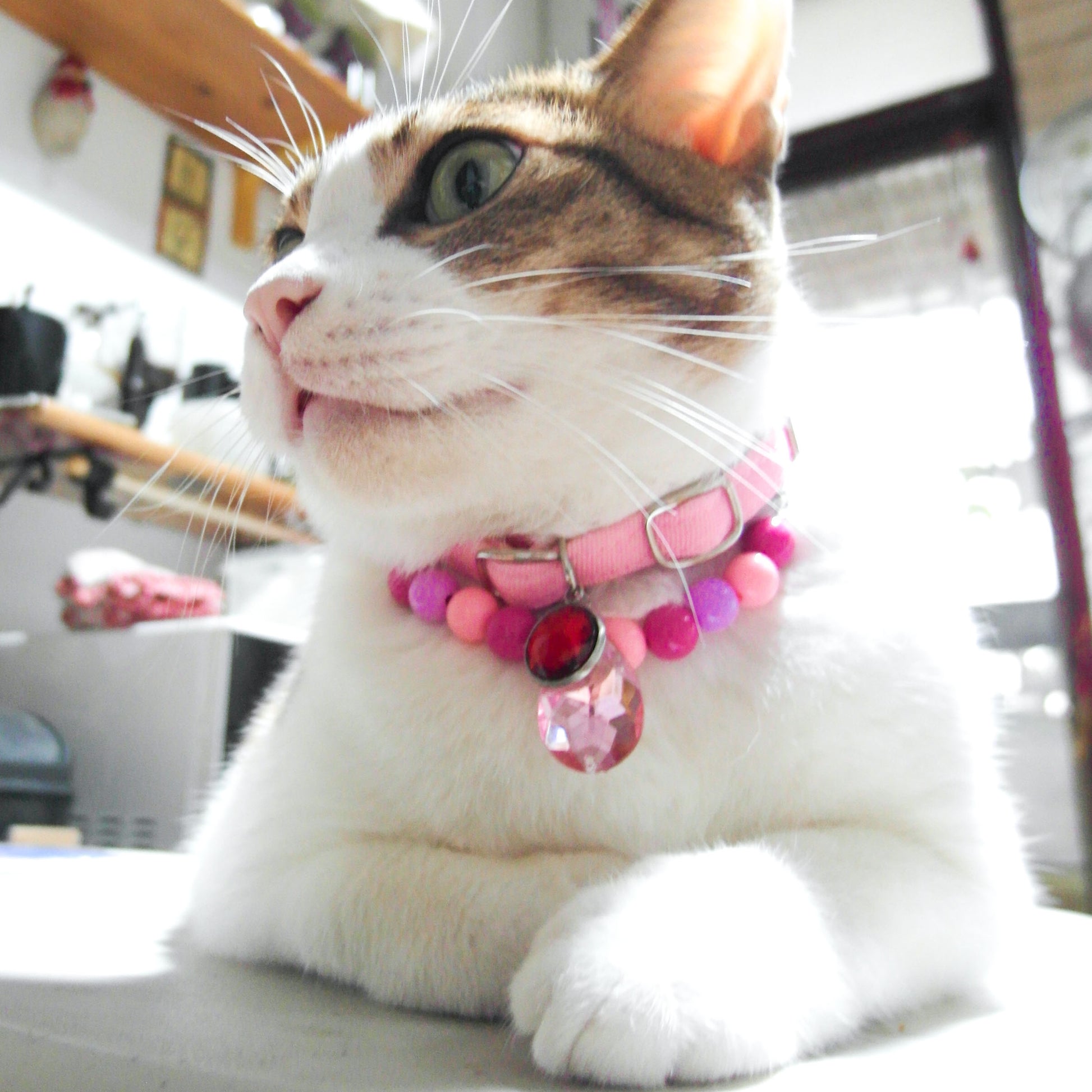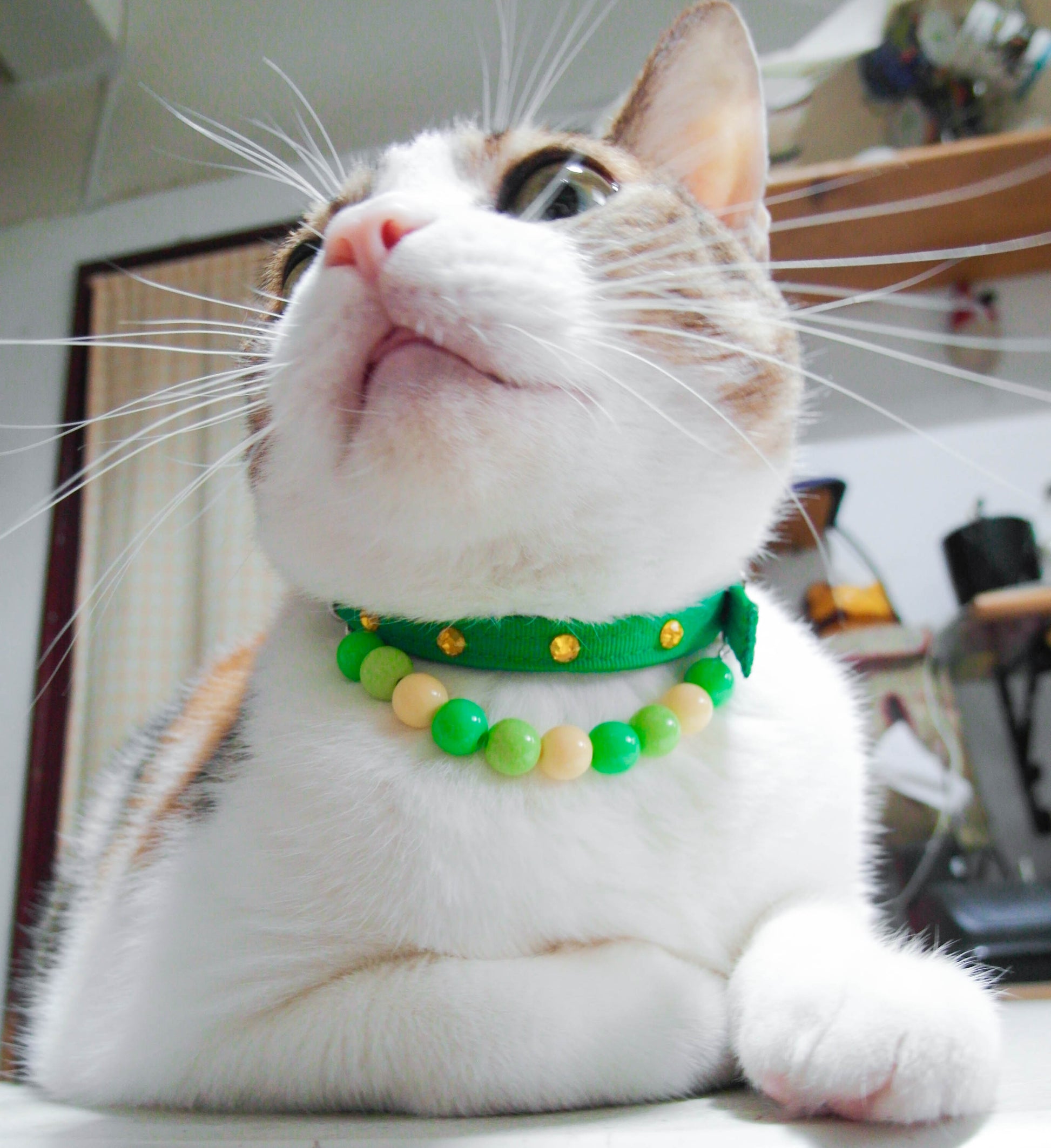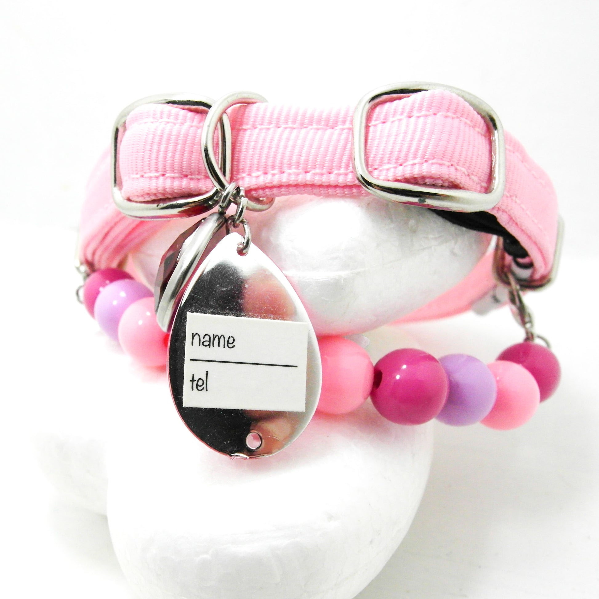 閃亮水鑽造型安心名牌,背面可貼上內附的聯絡資訊貼紙,好讓指引出回家的路。雙色甜美配色串珠項線,粉紅草莓與綠薄荷皆難以抗拒!獨家彈性安心項圈設計,彈性繩受力自動變長好鬆脫,緊緻造型之外,更讓安心滿分。為貓咪量身定製的大小合適,美觀為上,更重要的是貓咪整天的舒適體驗。全項圈高品質 100% 手工裁切縫製,嚴選台灣優質緞帶,舒適的可調長度項圈,自由調整 20 ~ 50 cm,可一路陪伴各種大中小型貓的手工貓項圈。